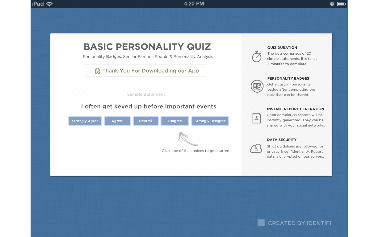 Today we are proud to be releasing the first of many mobile applications that will make the self discovery process a lot easier. The IDENTIFI – PTR (Personality Trait Report) helps users to take a simple 20 questions personality question and instantly generate a basic personality report with career suggestions for free.